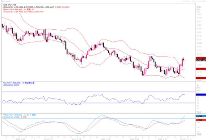 从技术面上来看,昨日黄金市场区间波动,早盘开盘在1712.1的位置后行情区间整理,日线最高触及到了1722.4的位置后行情回落,日线最低给到了1701.8的位置后行情整理日线最终收线在了1706.7的位置。日线级别图上,14日相对强弱指数(RSI)仍维持在中线上方,MACD主信号线维持上扬之态,显示黄金多头动能得到保持。金价短期阻力在100日移动均线(目前位于1717美元/盎司)。黄金多头需要看见金价日收盘高于100日移动均线,这对于金价进一步涨向10月高点1730美元/盎司至关重要。下行方面, 1700美元/盎司可能提供强劲支撑,一旦跌破这一关口,不排除金价大幅跌向50日移动均线1674美元/盎司的可能性。