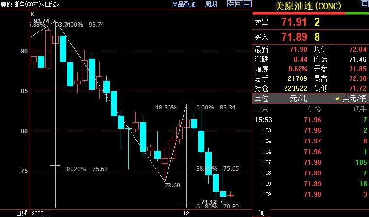 北京时间15:53,NYMEX原油期货上涨0.29%至71.67美元/桶;ICE布伦特原油期货上涨0.24%至76.35美元/桶。两市隔夜均创2021年12月下旬以来新低,分别至71.12美元/桶和75.74美元/桶。